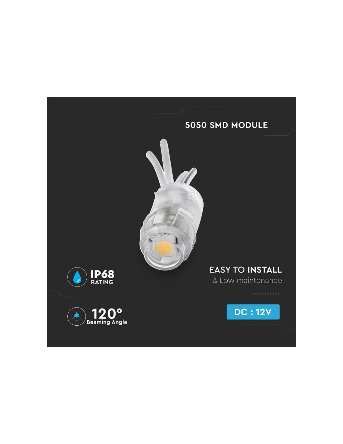 L'articolo v-tac con sku 5137, categoria strip led - moduli led: modulo led potenza vt-28356 monocolore composto da 1 led smd 5050 con potenza di 0,24w e flusso luminoso di 20 lm il modulo è ideale per l'installazione all'interno di scatolari ad illuminazione diretta e non, ed è utilizzable anche nell'illuminazione architettonica di interni ed esterni grazie al grado di protezione ip65 e il corpo in pvc. Date le ridotte dimensioni, è possibile creare insegne pubblicitarie o di segnalazione con qualsiasi misura e spessore il fascio luminoso di 120° consente una distribuzione omogenea della luce il collegamento tra i moduli effettuato con cavi, permette di alimentarli da un unico punto questo modulo permette infiniti tipi di utilizzo sia in ambito domestico che industriale